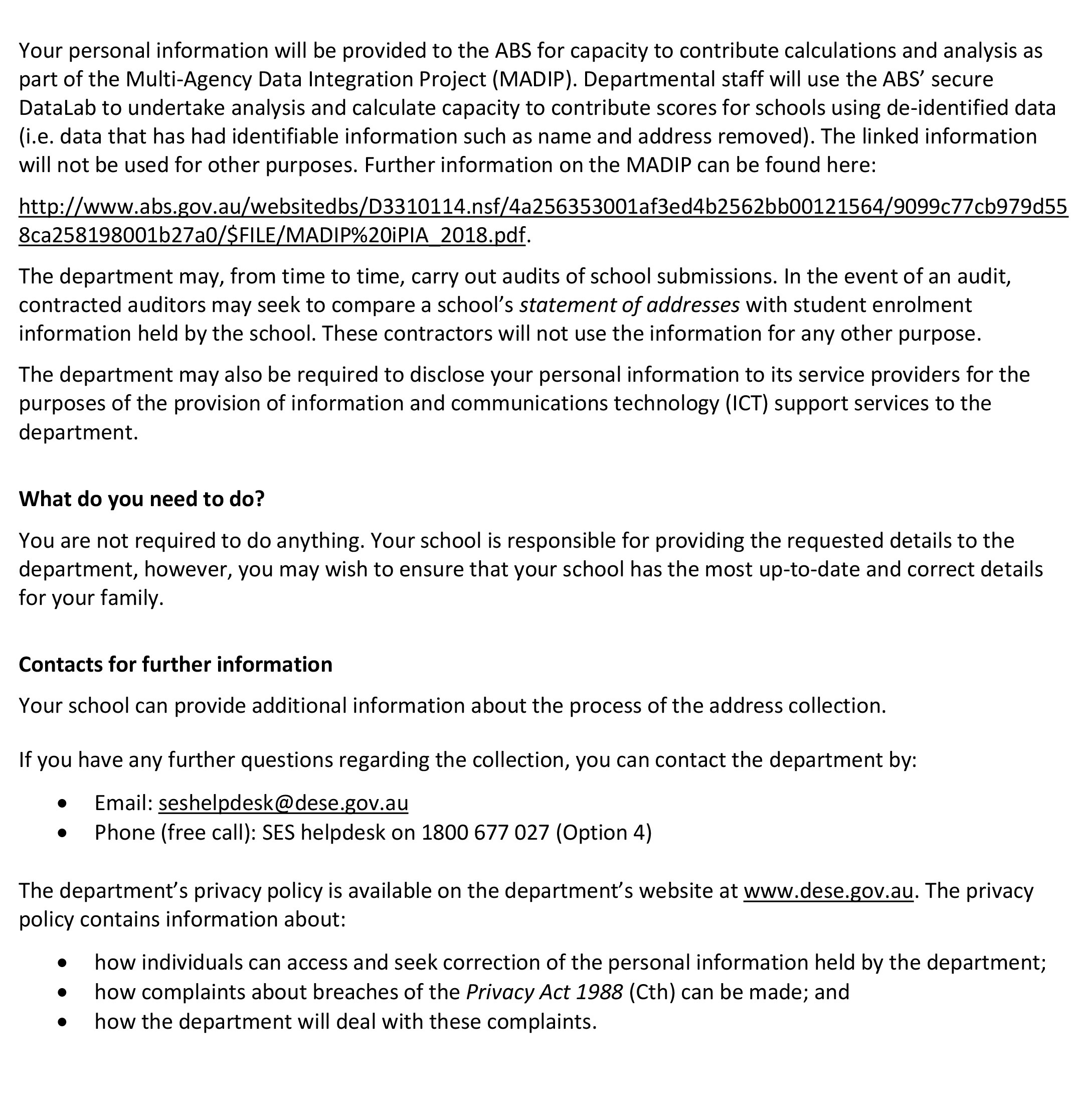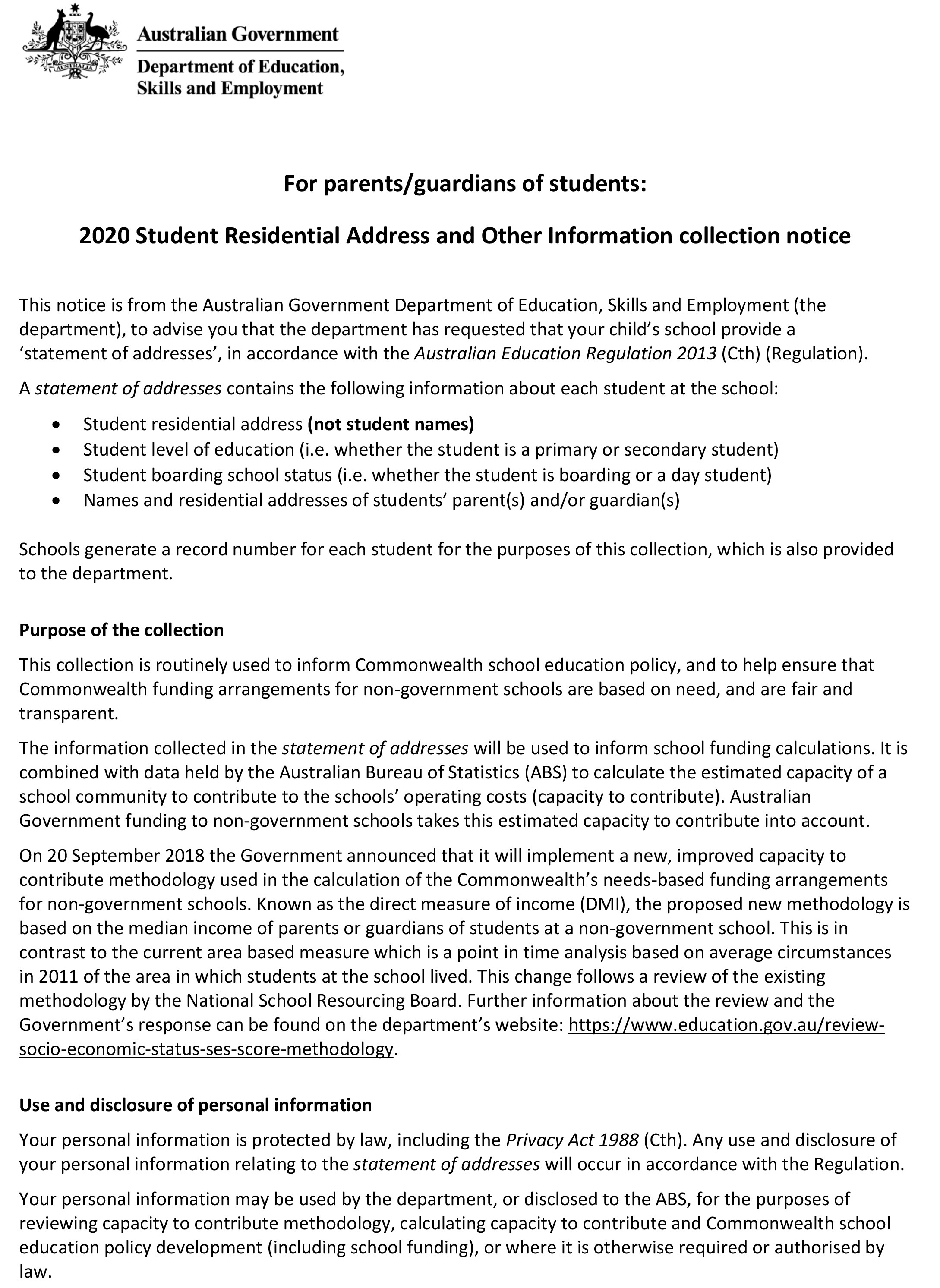 2020 Student Residential Address and Other Information collection notice